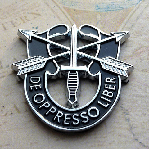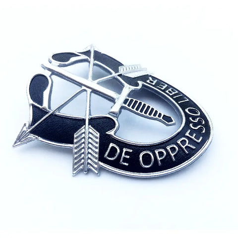 The crest is the crossed arrow collar insignia (insignia of branch) of the First Special Force, World War II. The motto is translated as "From Oppression We Will Liberate Them."